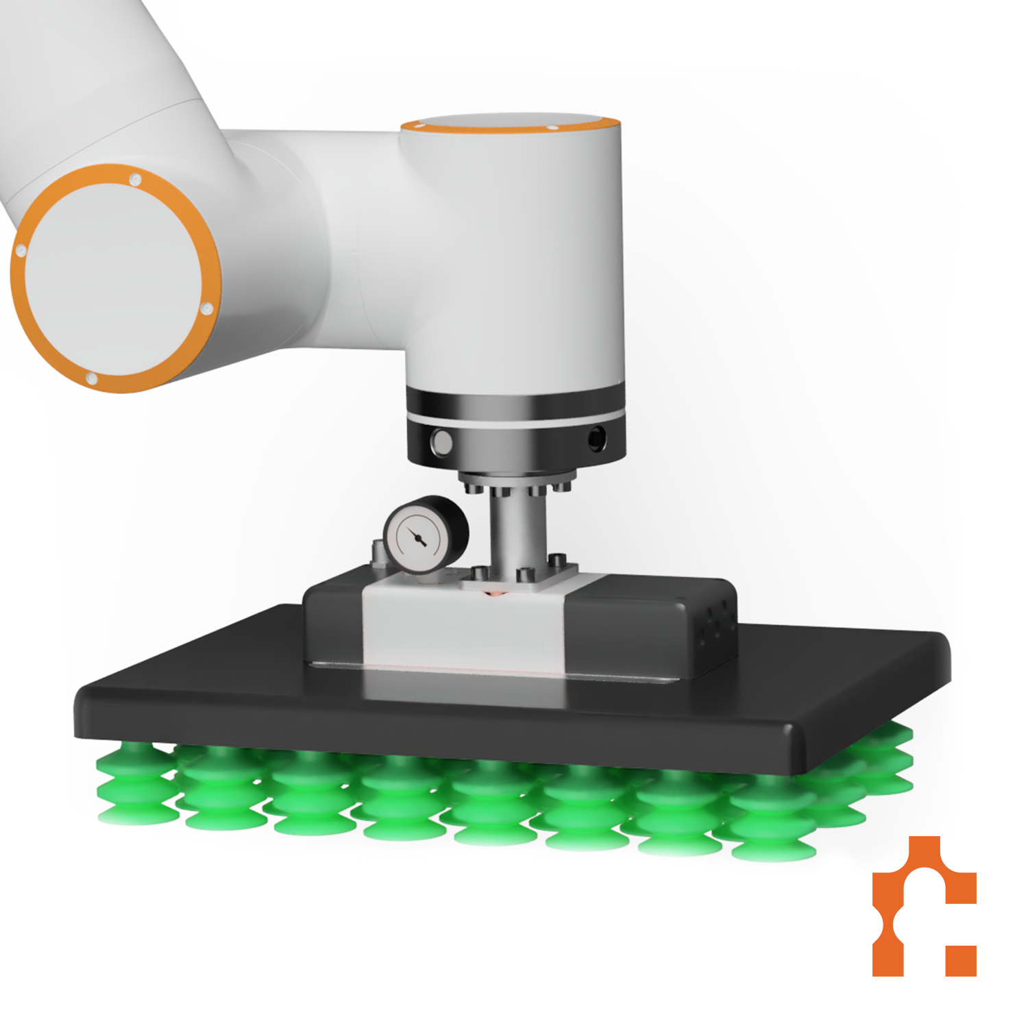 This plug and play vacuum gripper set has been put together in collaboration with Schmalz, market leader in vacuum technology. This gripper is ideal for picking up boxes, among other things, a common application in palletizing.